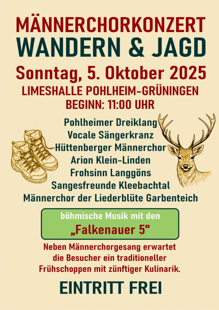 Am Sonntag, den 5. Oktober 2025, lädt der Pohlheimer Dreiklang herzlich zum großen Männerchorkonzert unter dem Motto „Wandern & Jagd“ ein. Die Veranstaltung findet in der Limeshalle Pohlheim-Grüningen statt und beginnt um 11:00 Uhr.
